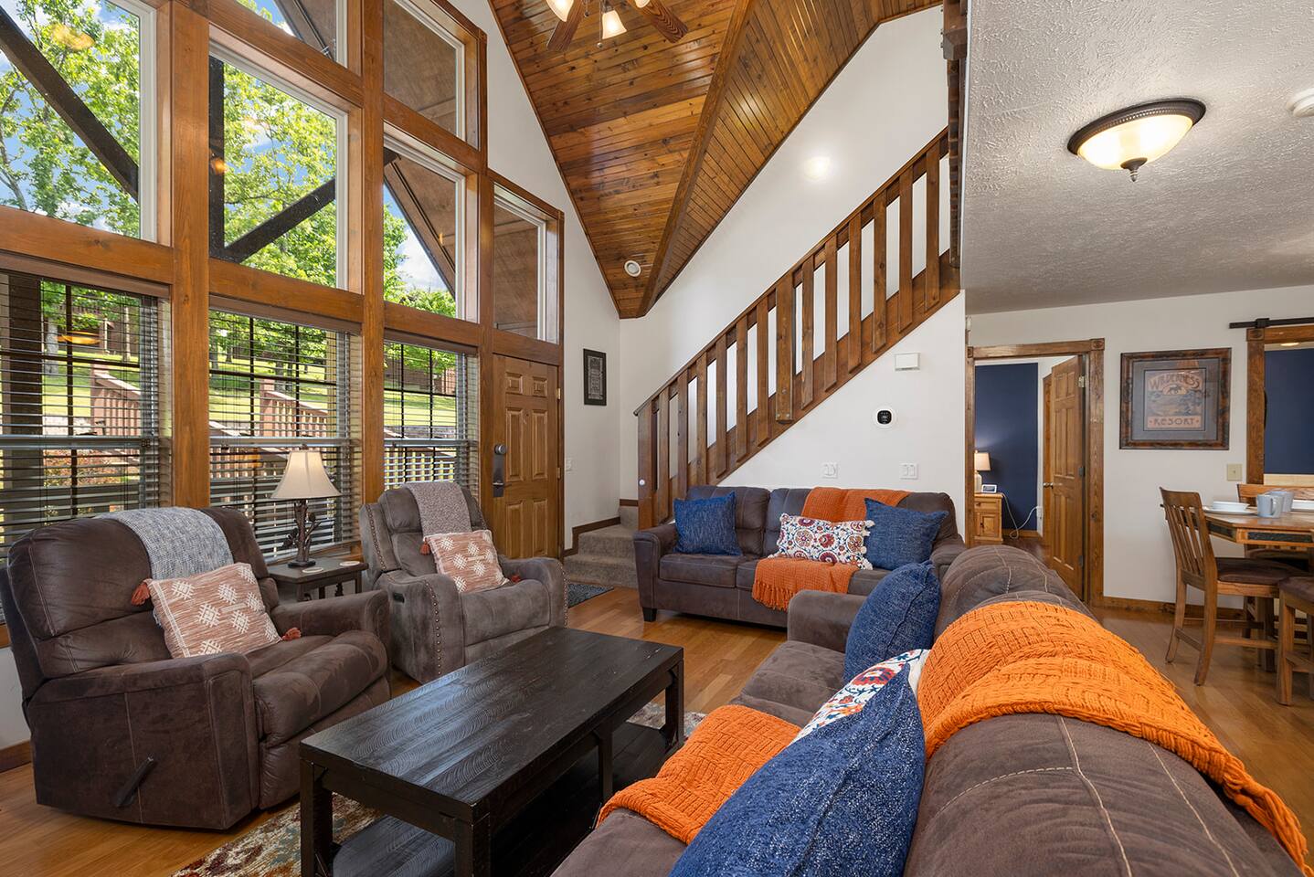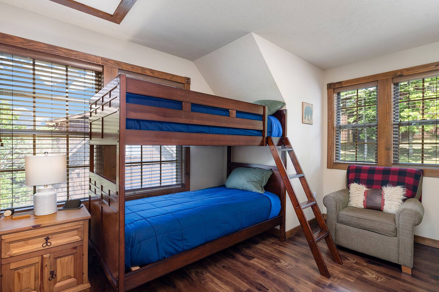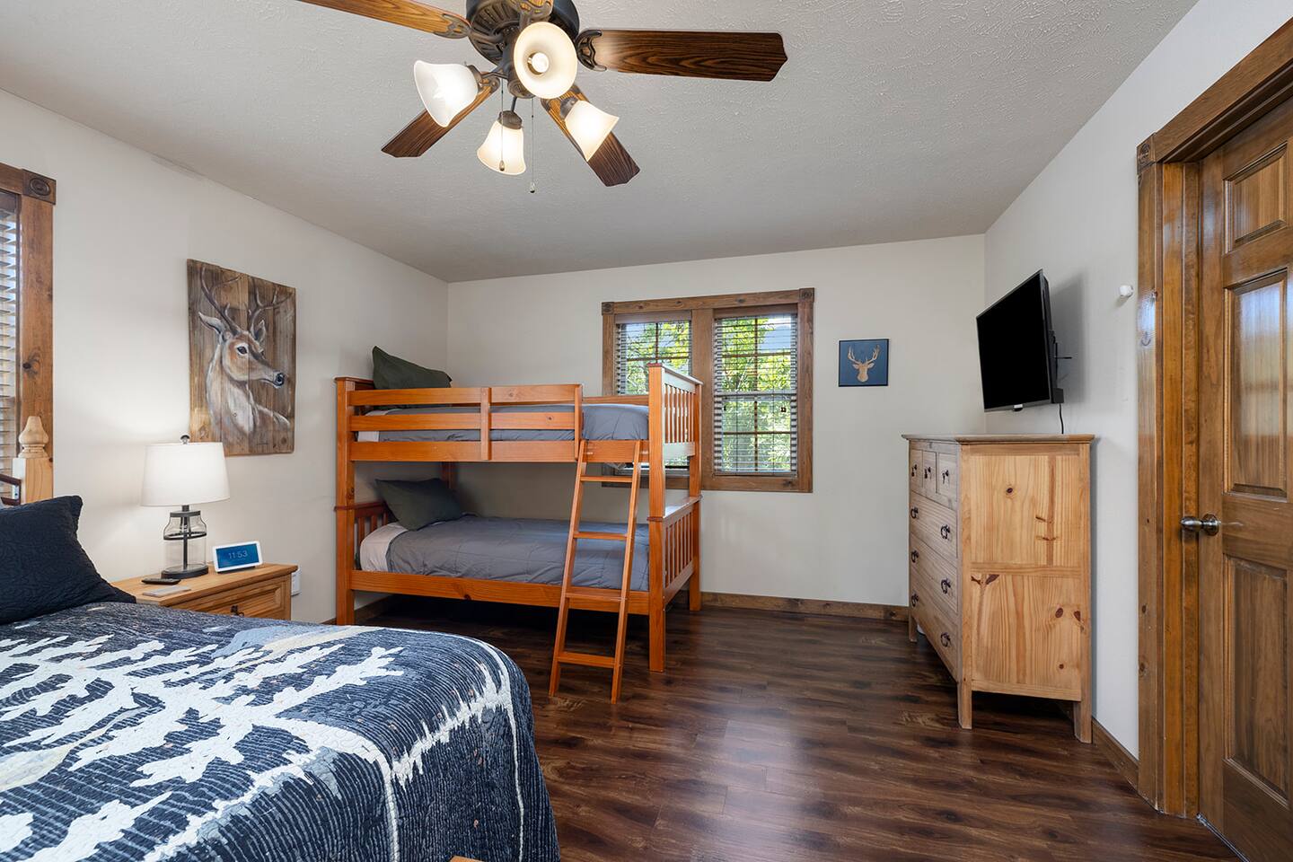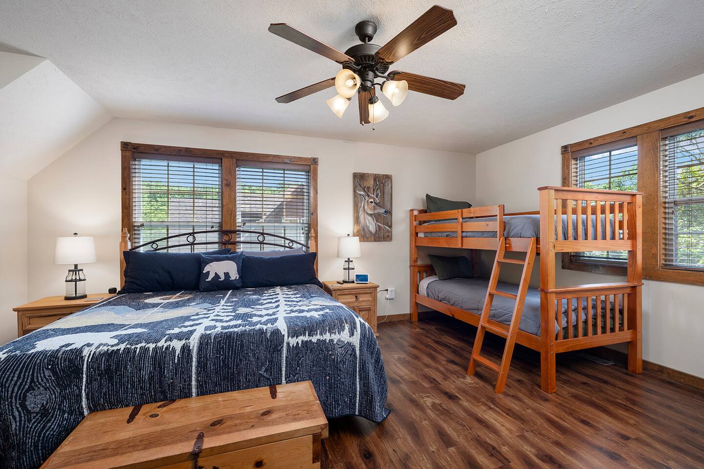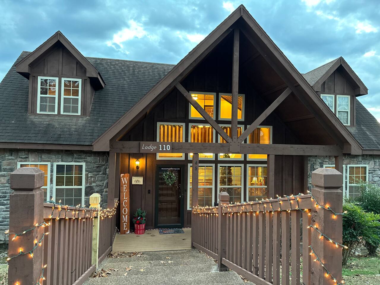 Our spacious and family friendly lodge is located in the gated community of Stonebridge. It’s the perfect place to gather with friends and family to relax and enjoy all that Branson and the Ozarks have to offer. Our cabin features 4 master bedroom suites with king beds and 4 attached jacuzzi bathrooms. The two upstairs bedrooms also have a twin bunk bed in each bedrooms. There is a $7 fer per vehicle per night collected by the Stonebridge POA. This is not paid to any of the lodge owners.