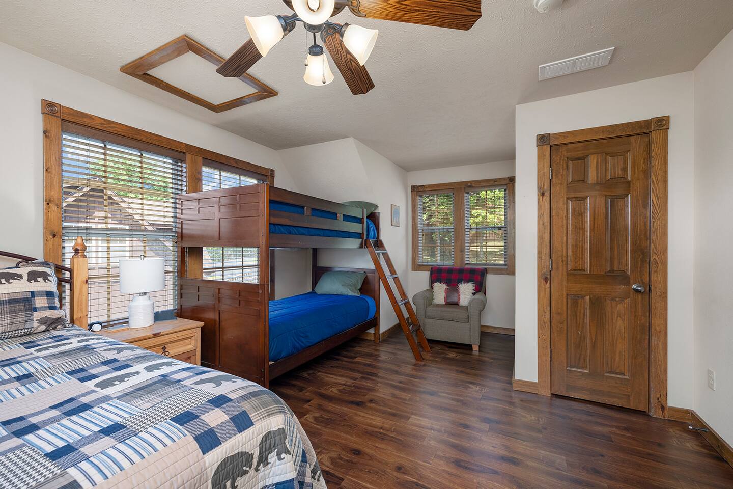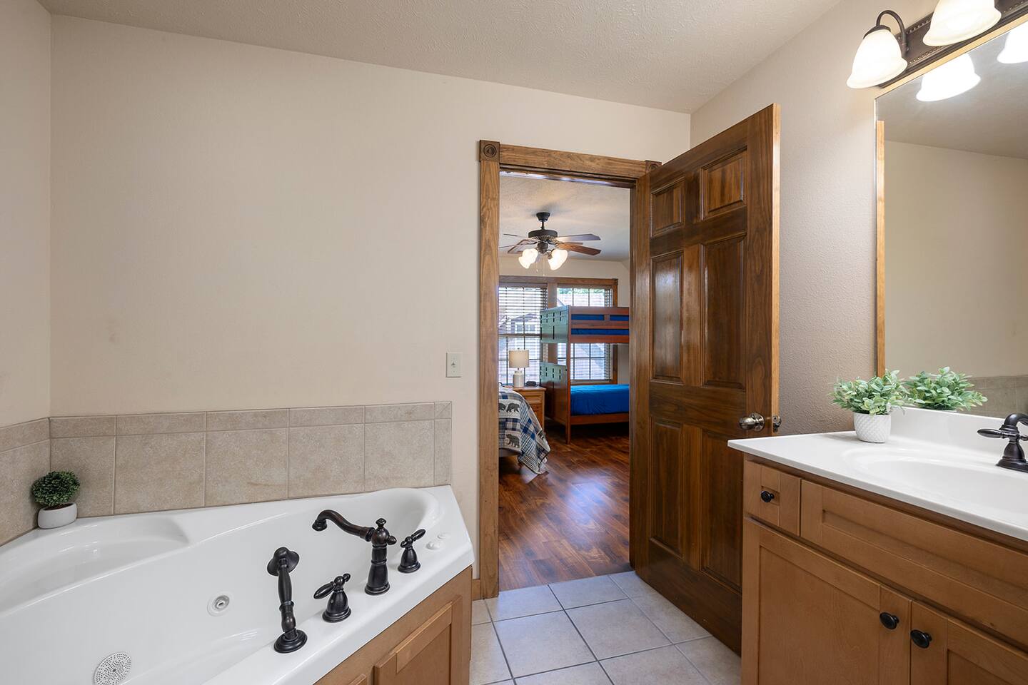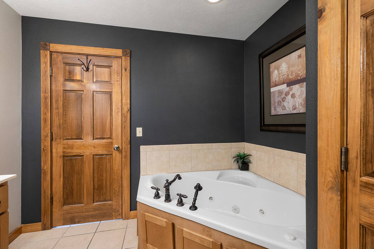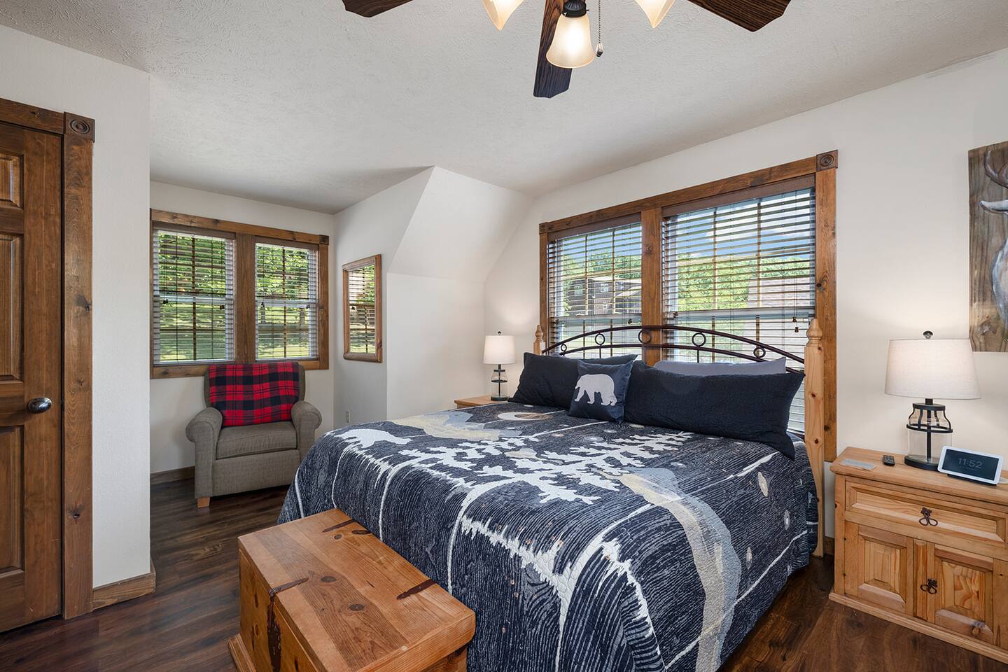 Our spacious and family friendly lodge is located in the gated community of Stonebridge. It’s the perfect place to gather with friends and family to relax and enjoy all that Branson and the Ozarks have to offer. Our cabin features 4 master bedroom suites with king beds and 4 attached jacuzzi bathrooms. The two upstairs bedrooms also have a twin bunk bed in each bedrooms. There is a $7 fer per vehicle per night collected by the Stonebridge POA. This is not paid to any of the lodge owners.