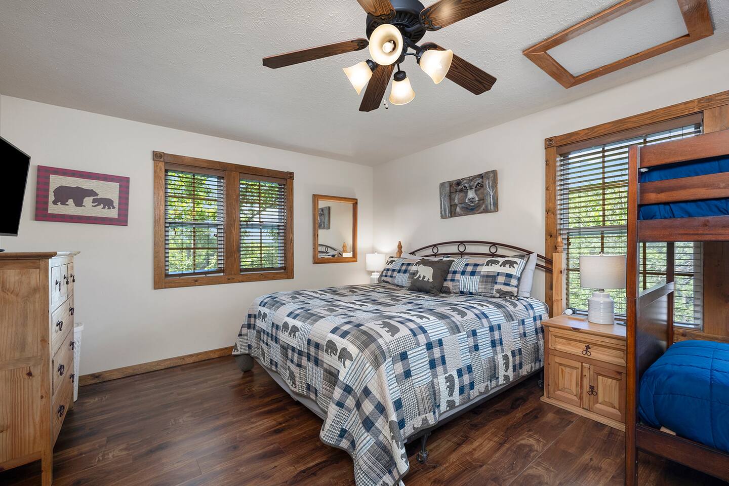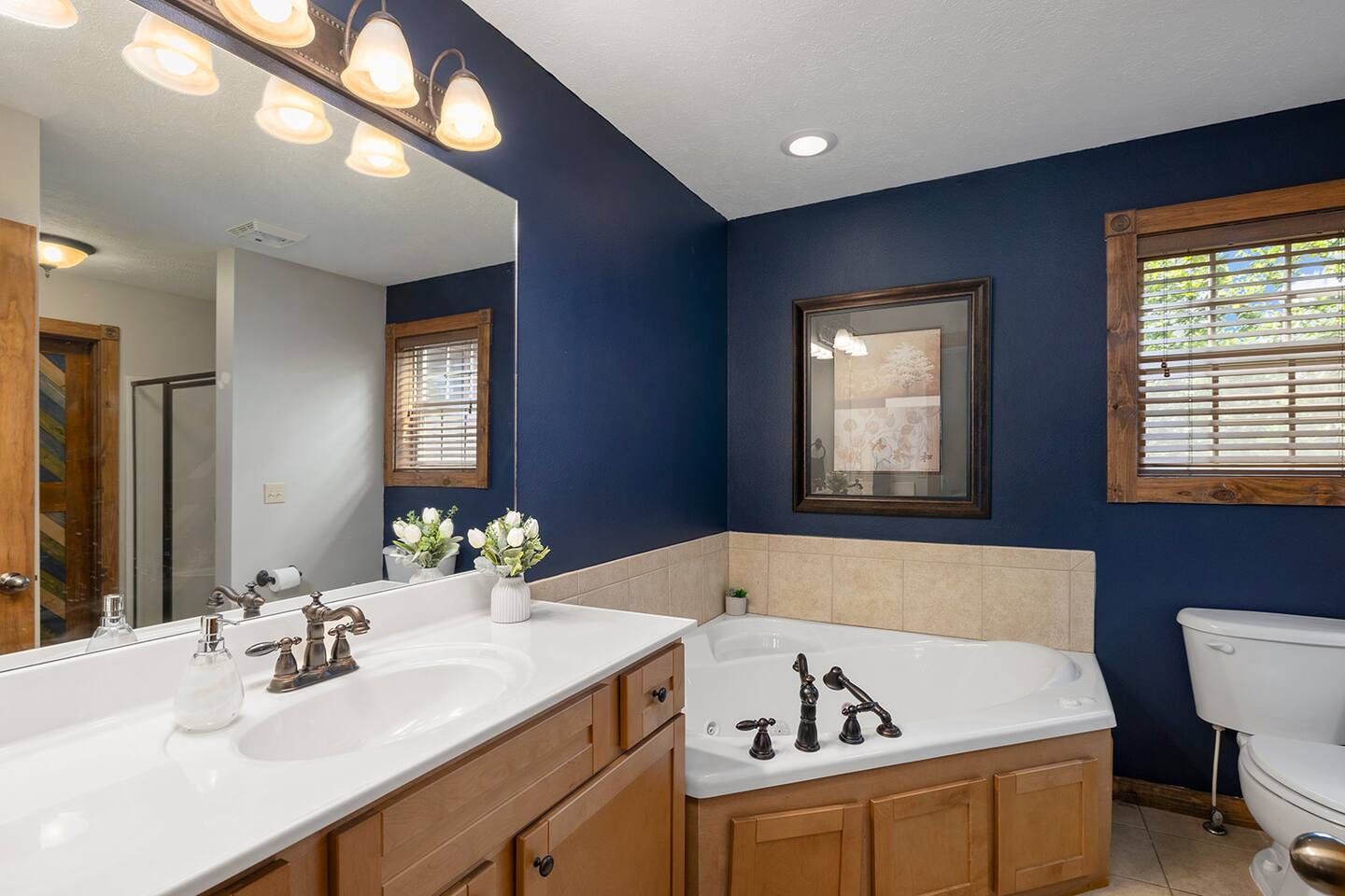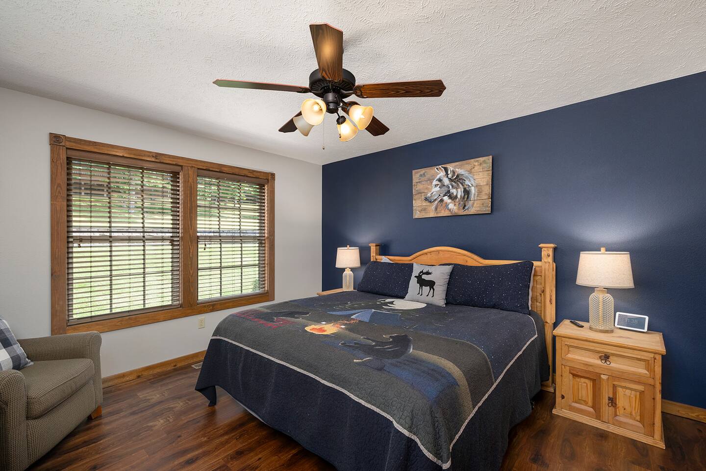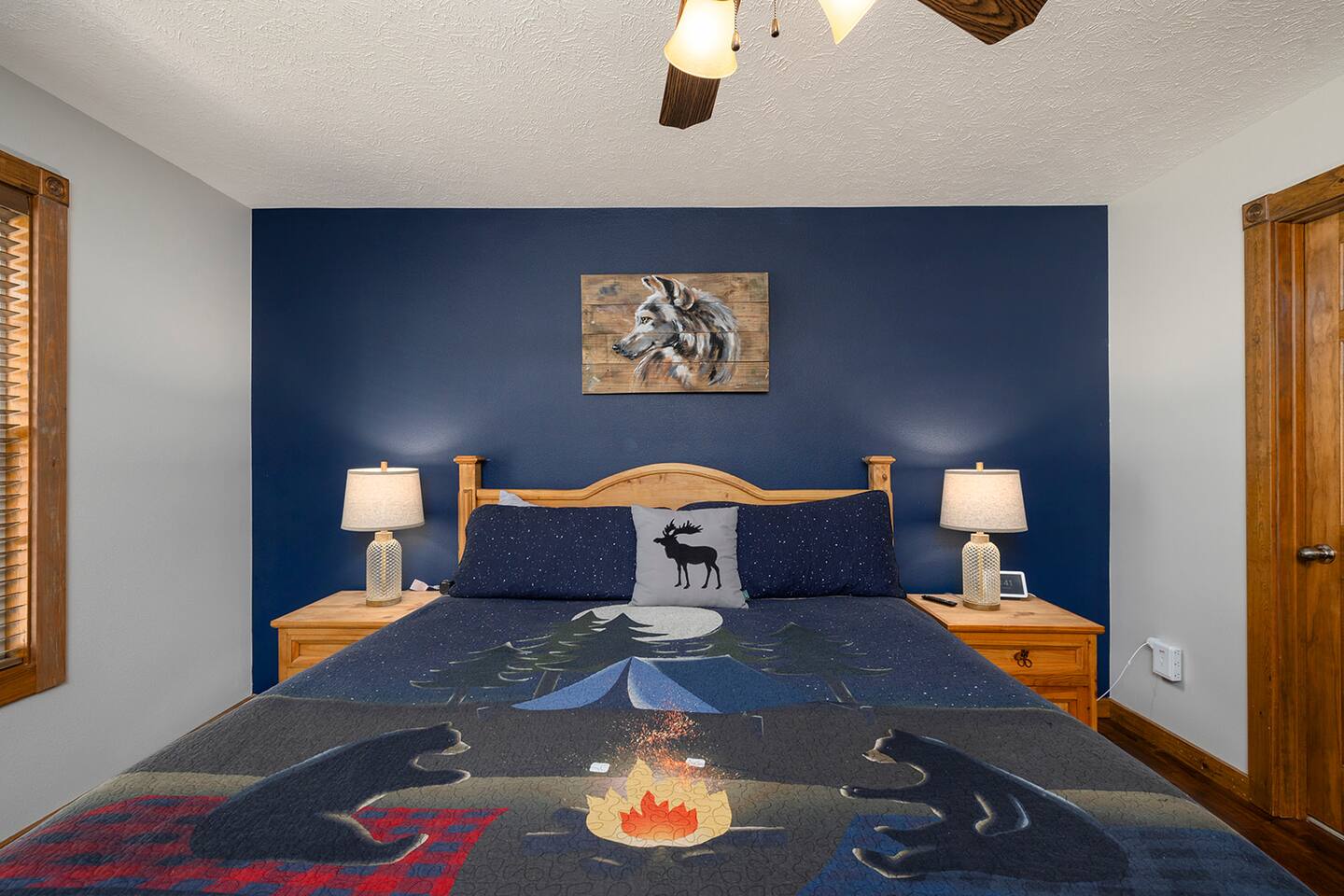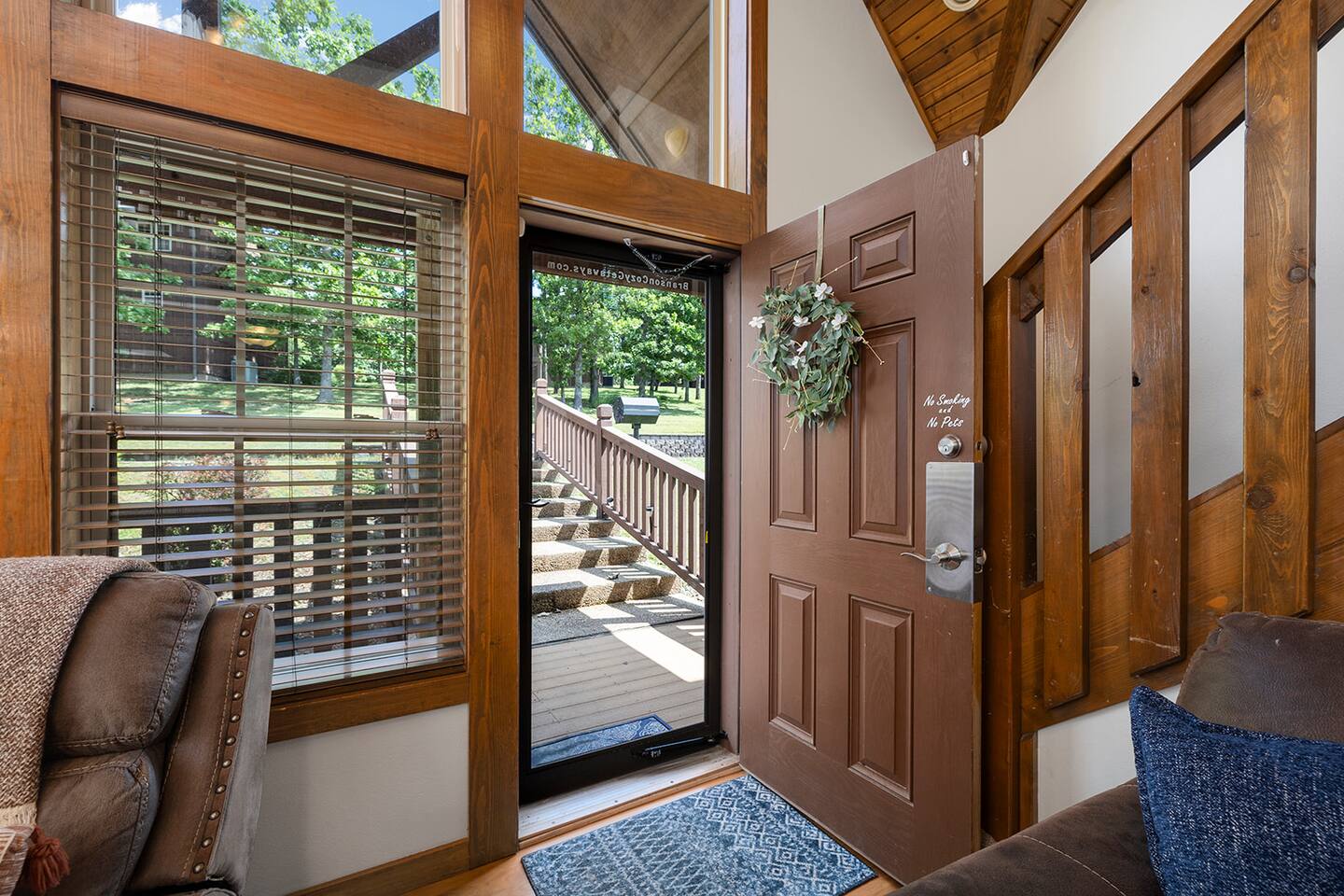 Our spacious and family friendly lodge is located in the gated community of Stonebridge. It’s the perfect place to gather with friends and family to relax and enjoy all that Branson and the Ozarks have to offer. Our cabin features 4 master bedroom suites with king beds and 4 attached jacuzzi bathrooms. The two upstairs bedrooms also have a twin bunk bed in each bedrooms. There is a $7 fer per vehicle per night collected by the Stonebridge POA. This is not paid to any of the lodge owners.
