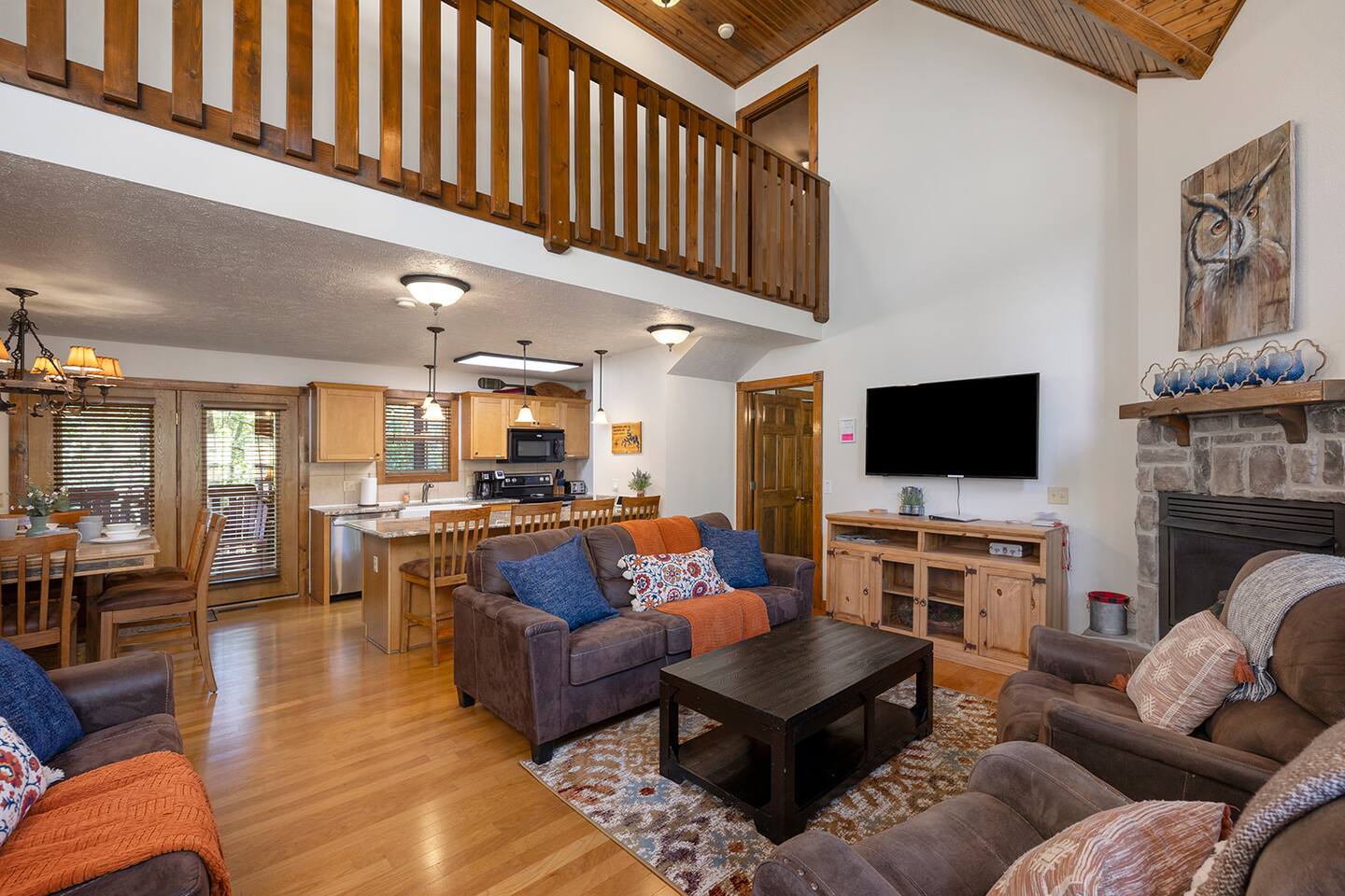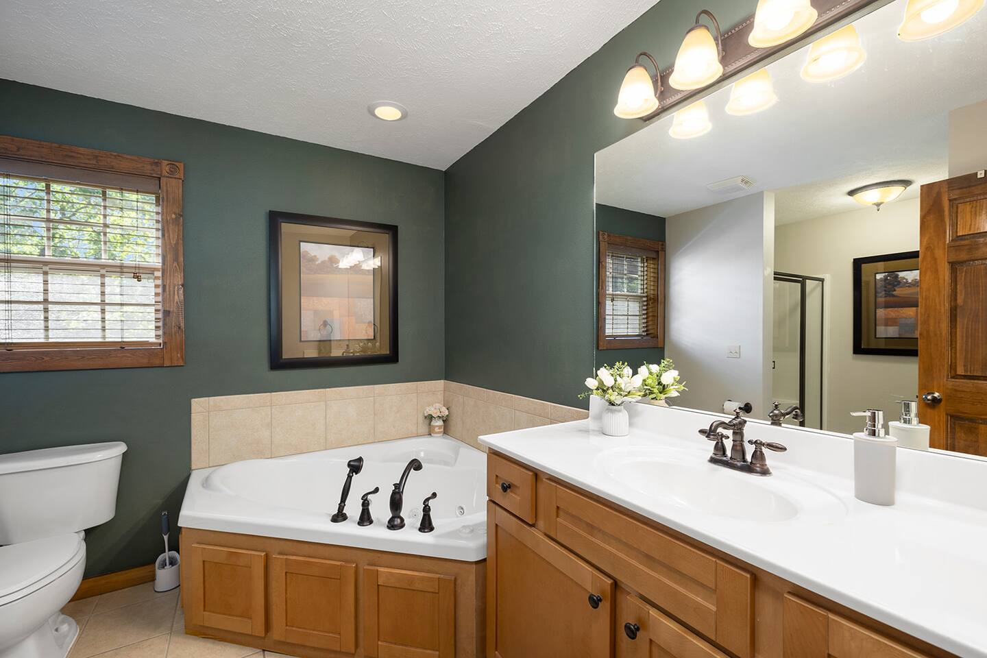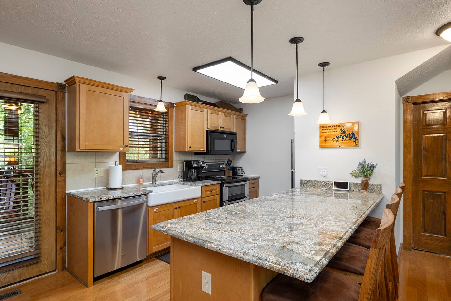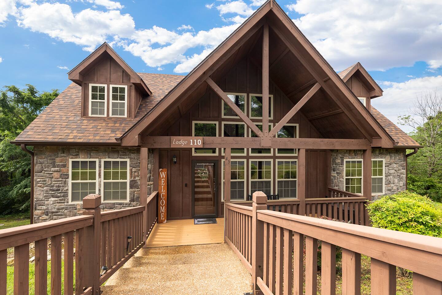 In addition to the numerous amenities that Stonebridge Resort has to offer, you are just minutes away from Silver Dollar City, Table Rock Lake, and all the attractions Branson has to offer. Upon arrival you will enter through the covered archway and into the gated community. From there you will drive past the clubhouse through the rolling hills and gorgeous 18-hole golf course, and you will see the catch and release lake and playground and pool area as you near the lodge. Our lodge offers an open concept living experience with four large master suites, each having its own private bathroom featuring showers and whirlpool tubs. Each spacious bedroom has a king size bed, a flat screen TV with cable and accommodations for your personal items. The heart of the lodge is the cozy living room including a family room with vaulted ceilings, dining area and fully equipped kitchen. You can enjoy time with your family watching the flat screen TV, playing games or reading a book by the cozy fireplace. To enjoy the outdoors, the dining area opens to the oversized screened-in deck which is a great place to enjoy your morning coffee or evening meals. Of course, the lodge provides free high speed wi-fi for all your internet needs. The Stonebridge Resort includes many amenities for our guests such as multiple swimming pools, playgrounds, walking trails and a catch and release fishing lake (no license required). If you venture up to the Ledgestone Clubhouse, you also find another swimming pool, tennis courts, a workout facility, a fully equipped golf pro shop and the clubhouse restaurant. We hope you enjoy your stay at our lodge, where you will surely make lasting memories with your friends and family. We are here to assist in any way possible and hope to see you again on your next visit to Branson.