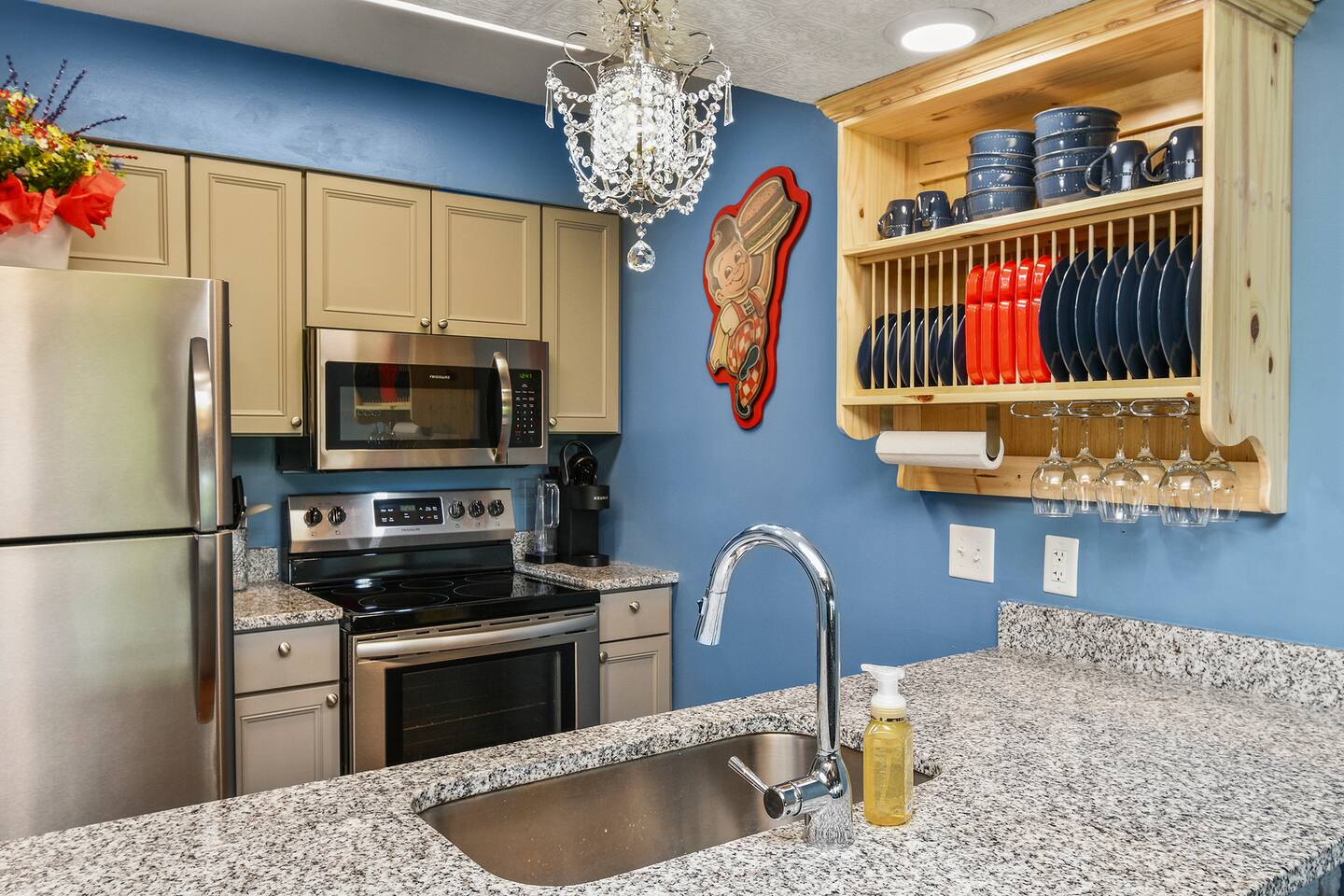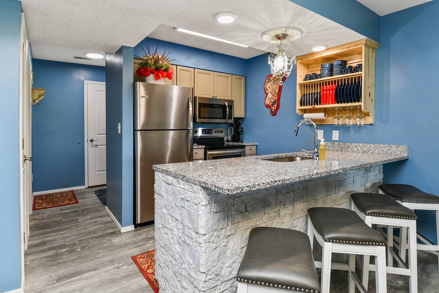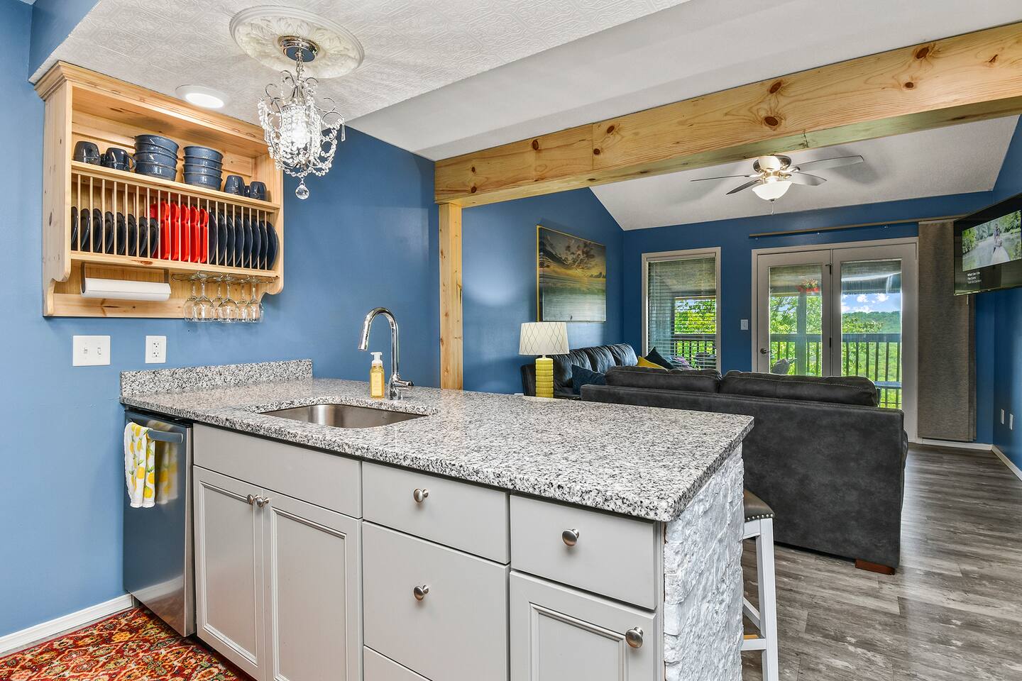 Our Colorful Fun-Filled condo has everything you could imagine. Two full bedrooms with the Master bedroom having 1 king bed, the Guest bedroom has 1 queen bed, and the living room has a full sized sofa sleeper. The updated kitchen features all newer stainless steel appliances including a dishwasher, fully stocked with dishes, spices, pots & pans etc. Even the kiddos have their own dining ware. Both bathrooms are fully stocked with shampoo, conditioner & refreshing body wash. Wall mounted blow dryers are new and both bathroom have been recently remodeled. We have a new Maytag Commercial washer & dryer and a new HVAC with Nest thermostat. Enjoy 2 full size decks. Whether you want to sit and relax on the front or back deck, they are full sized and ready for you to relax. The amenities are endless at Notch Estates and our location is SUPREME! We are just 5 minutes to SDC and 10 minutes to the ever so popular Table Rock Lake.