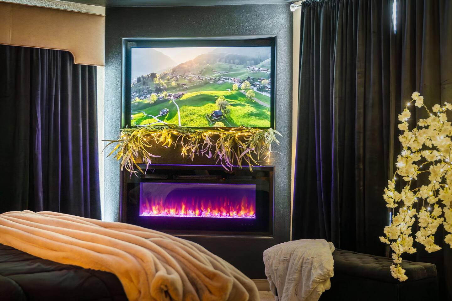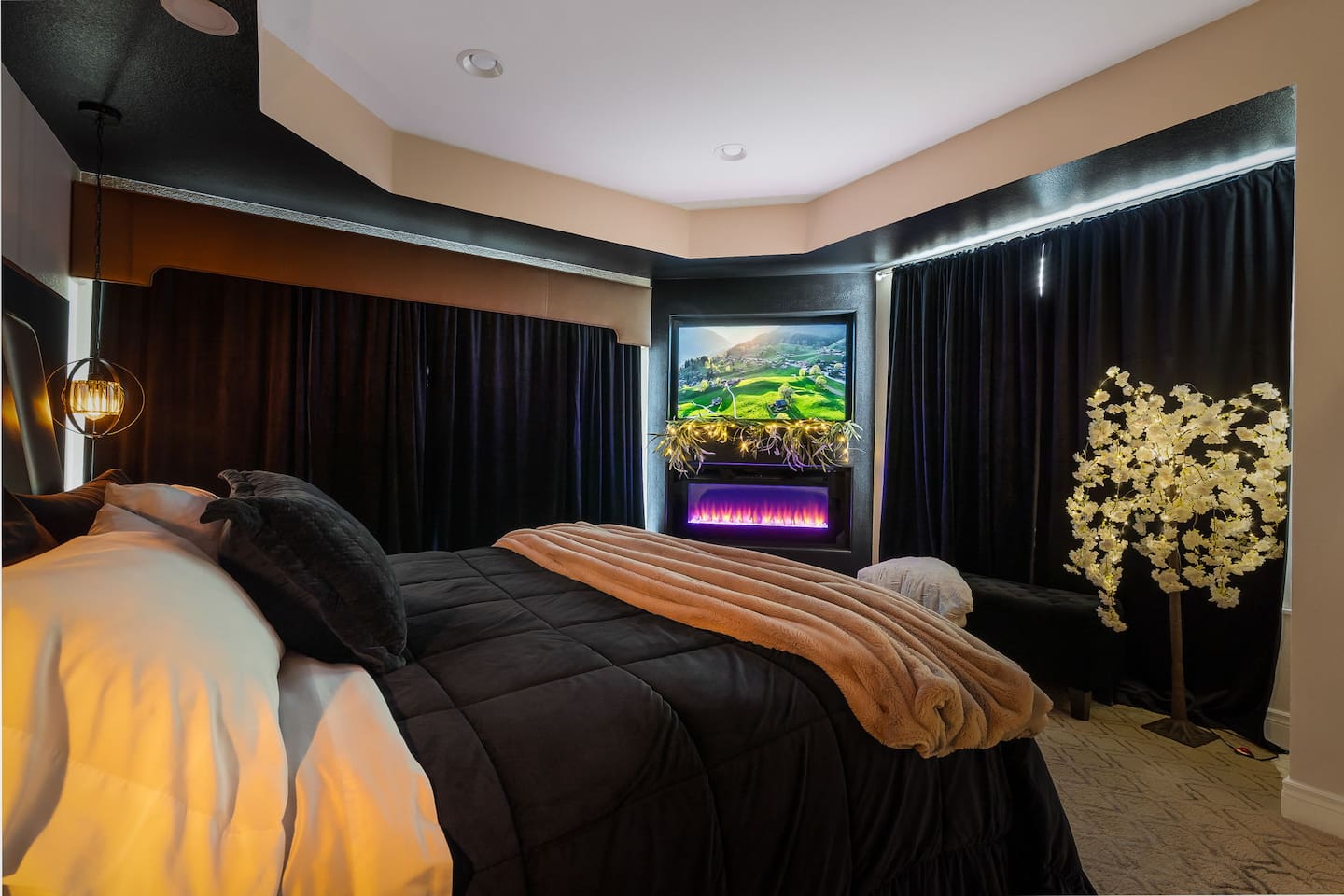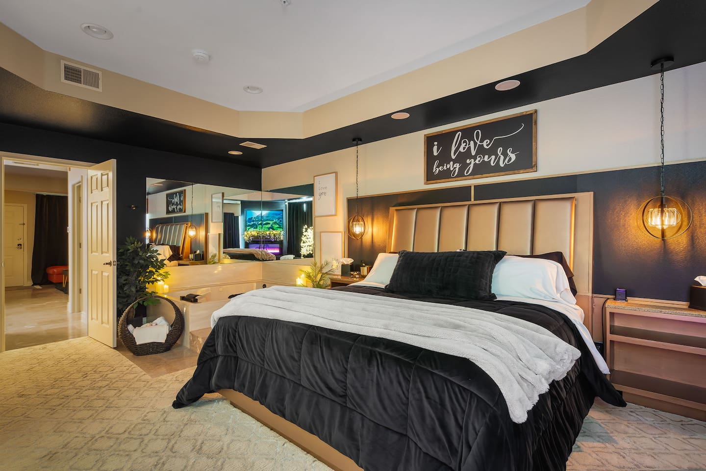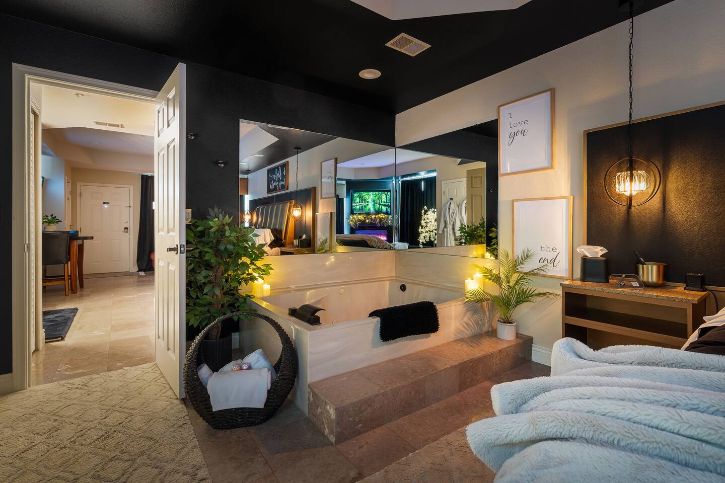 ~Perfectly Romantic~ a condo for couples only!! Perfect for your Honeymoon, Anniversary, Birthday or just for a romantic stay! Come home to this cozy condo after a day of fun and relax in your jetted tub for 2, or enjoy the big screen TV while lying in bed with the fireplace on. It feels like you're away from the city but it's just around the corner. This luxury condo is close to everything, making it easy to plan your visit. Kitchenette (no stove/oven) walk in ground floor, air, WiFi, & cable.