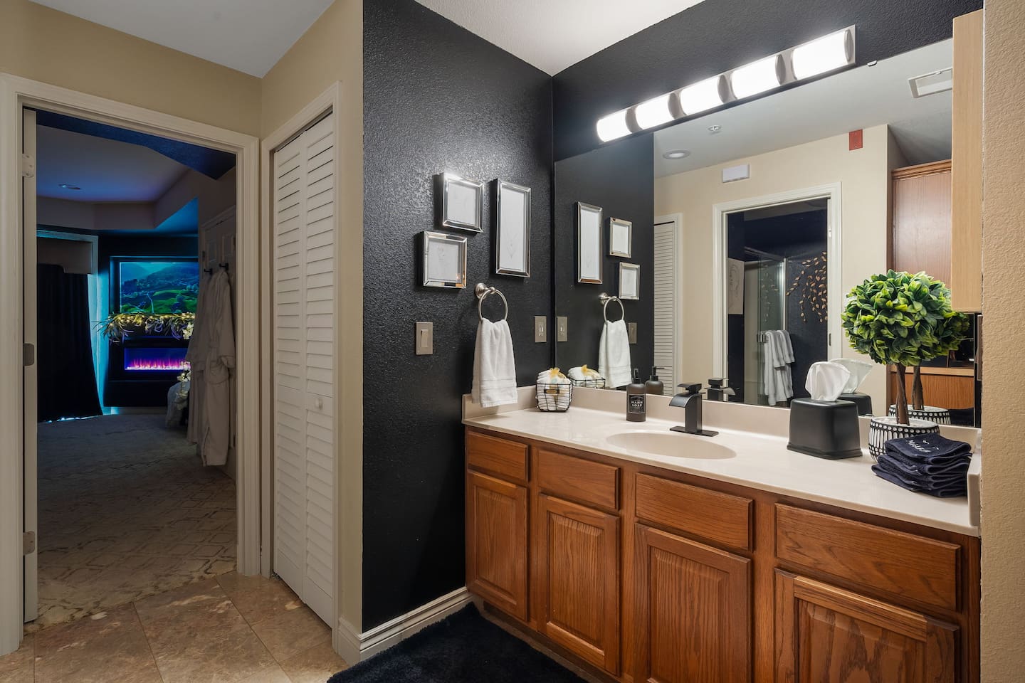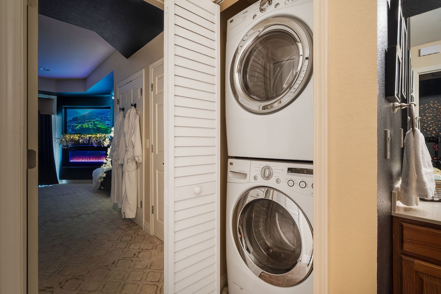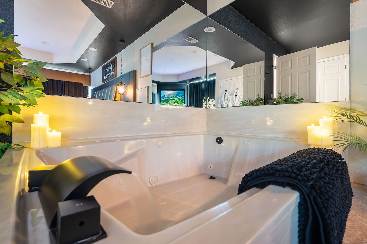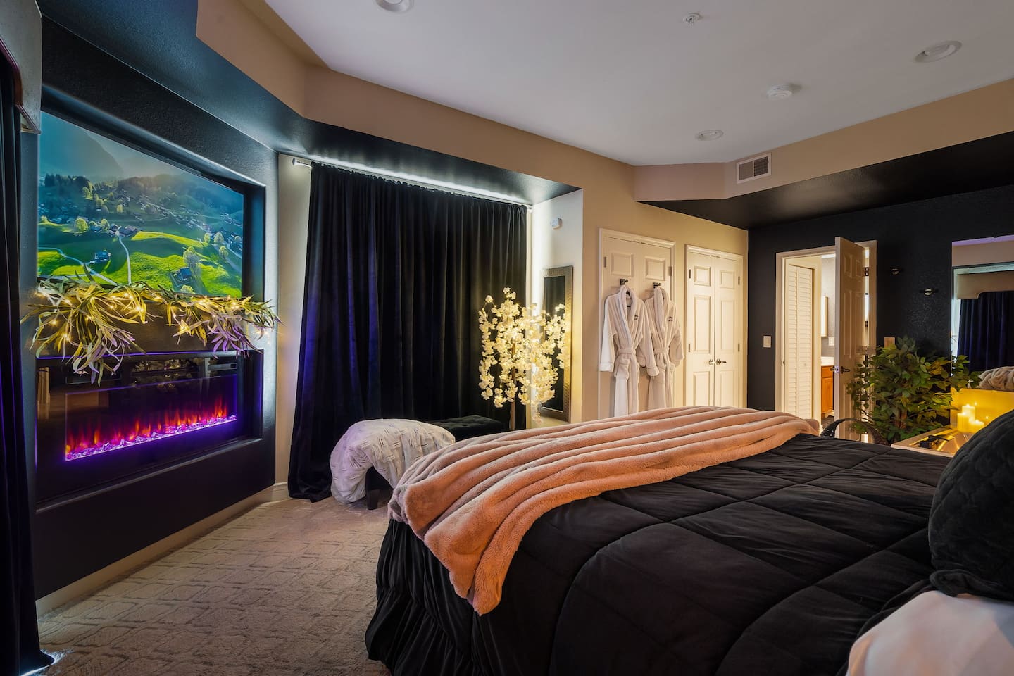 ~Perfectly Romantic~ a condo for couples only!! Perfect for your Honeymoon, Anniversary, Birthday or just for a romantic stay! Come home to this cozy condo after a day of fun and relax in your jetted tub for 2, or enjoy the big screen TV while lying in bed with the fireplace on. It feels like you're away from the city but it's just around the corner. This luxury condo is close to everything, making it easy to plan your visit. Kitchenette (no stove/oven) walk in ground floor, air, WiFi, & cable.