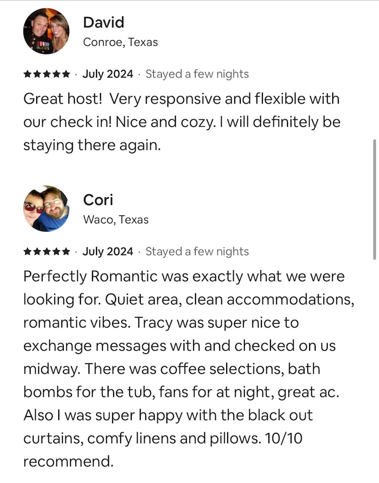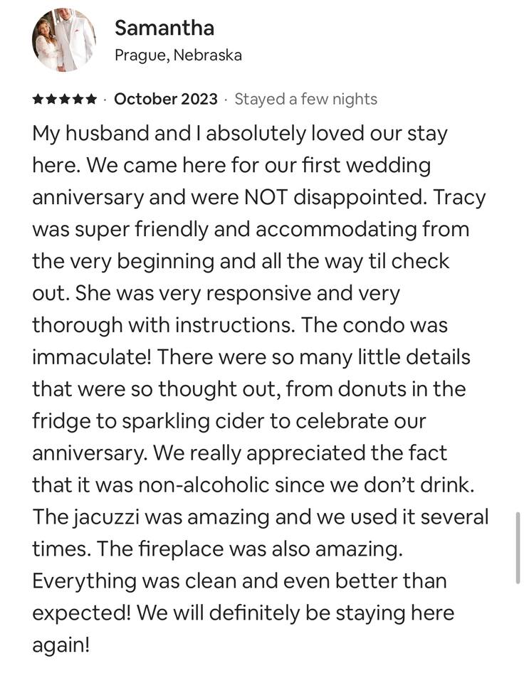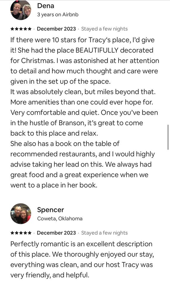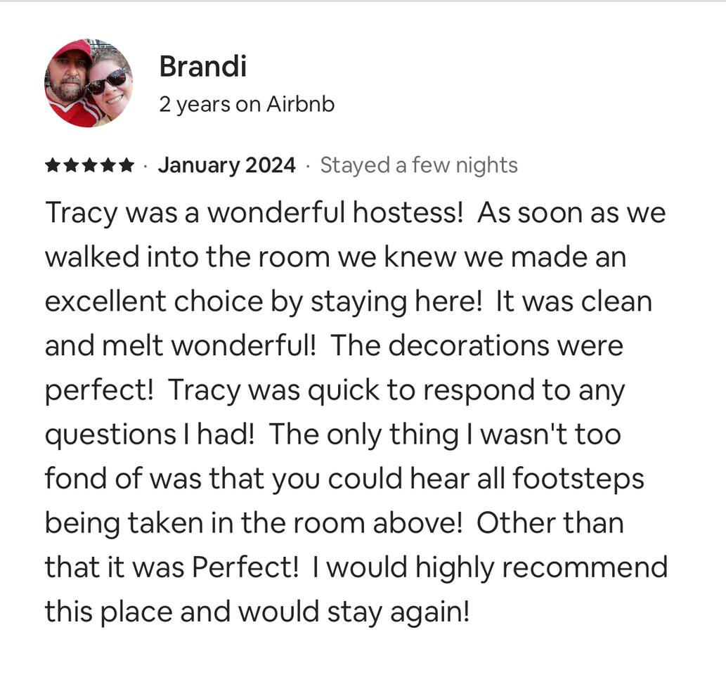 This place was so beautifully decorated for christmas. Looked just like the pictures and felt just like home. Hosts were very helpful & quick to answer when we had an issue with wifi for a second. DEFINITELY would recommend this place if you are looking for a romantic getaway. I absolutely loved this and we would choose this place again if we came back.